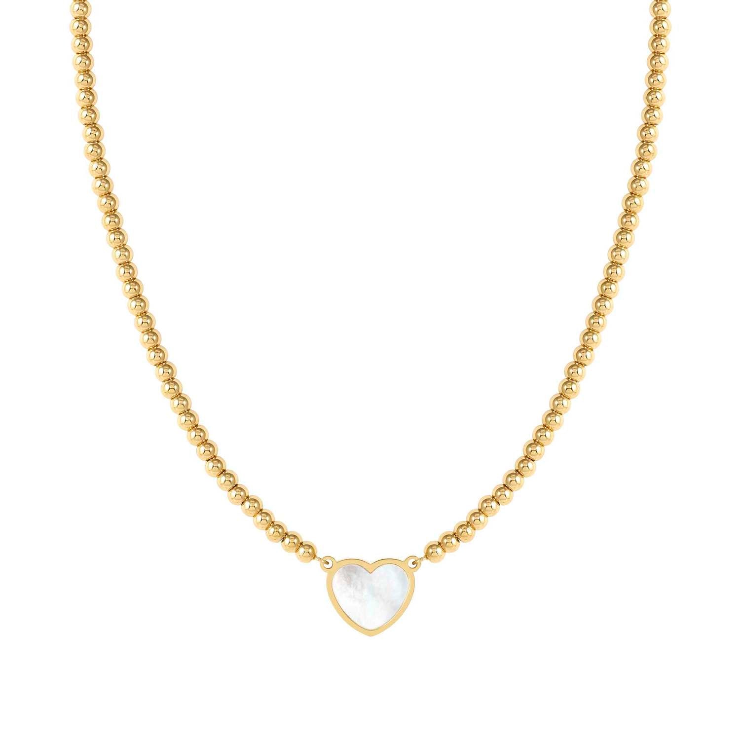 Stainless Steel Full Beaded Necklace with Yellow PVD Coated Finish with Mother of Pearl Heart Symbol