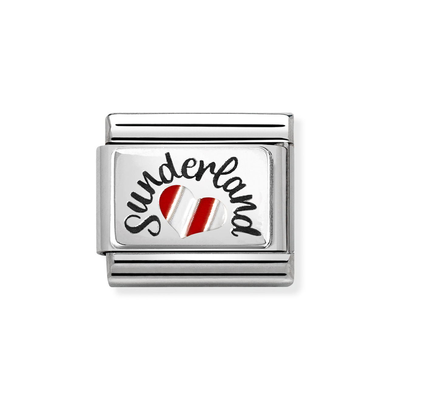 Classic Stainless Steel Link with Sterling Silver plate with text SUNDERLAND and Heart symbol with RED and white enamel stripes. Made in Italy.